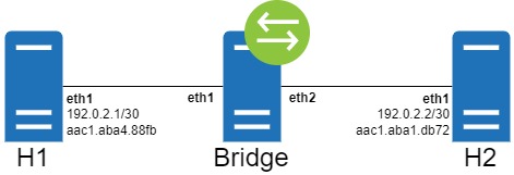 This article will feature three Linux hosts running Ubuntu 20.04. Hosts “H1” and “H2” are both connected to a host named “Bridge” via interface eth1. H1’s eth1 is assigned an IP address of 192.0.2.1/30 with the ip address add 192.0.2.1/30 dev eth1 command.