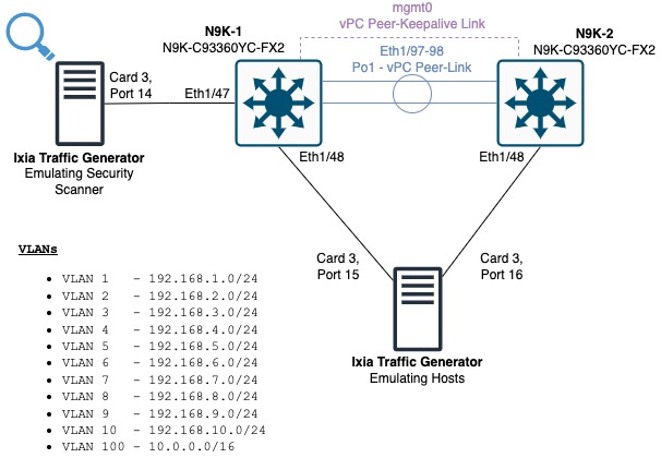 This topology has a total of eleven VLANs - VLANs 1-10, and VLAN 100. N9K-1 and N9K-2 are running HSRP (Hot Standby Router Protocol) and are both acting as gateways for each VLAN (as both vPC peers can act as gateways for vPC VLANs). Card 3 Port 15 of the Ixia emulates hosts in VLAN1-10, with one host per VLAN. Each host has an IP address ending in .10 (so 192.168.1.10 in VLAN 1, 192.168.2.10 in VLAN 2, etc.) Card 3 Port 16 of the Ixia emulates hosts identically, except each host has an IP address ending in .20 (so 192.168.1.20 in VLAN 1, 192.168.2.20 in VLAN 2, etc.). This emulates legitimate hosts in our production network, and each port sends traffic in a full-mesh manner such that our emulated production network has both intra-VLAN and inter-VLAN traffic flowing through both Nexus switches.