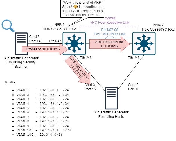 Card 3 Port 14 of the Ixia traffic generator emulates a security scanner. This port will send UDP packets towards random IP addresses in the 10.0.0.0/16 subnet associated with VLAN 100 sourced from 192.168.1.25 in VLAN 1. These packets are destined to the HSRP virtual MAC address, which means N9K-1 must route this traffic from VLAN 1 into VLAN 100. These packets will be treated as ARP Glean and will be punted to the control plane, as N9K-1 does not have ARP resolved for any IP address in the 10.0.0.0/16 subnet.