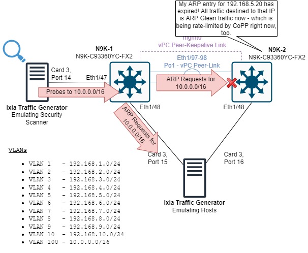 At first glance, this may not make sense. Both Nexus switches had a populated ARP table before the security scanner traffic started. When an ARP entry gets close to expiring, the Nexus should attempt to proactively refresh that entry by sending an ARP request for that IP to confirm the same IP/MAC binding is still valid. This traffic is ARP traffic, which should fall under the “copp-system-p-class-normal” CoPP class-map, not the Glean-focused “copp-system-p-class-l3uc-data”.
