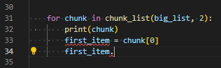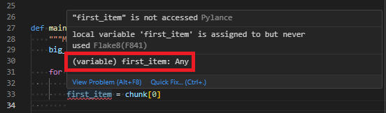 The problem is when we try to modify our code further to use the chunk variable pulled from the chunk_list function. Because we’ve type hinted the return value as Any, our IDE doesn’t know what options to offer us when trying to interact with this object. If we hover our cursor over the chunk object, it tells us it’s of type List[Any].