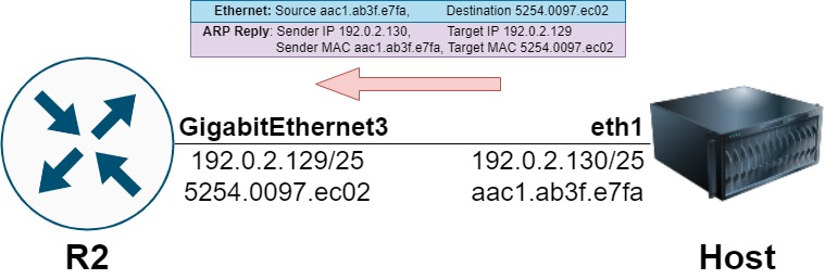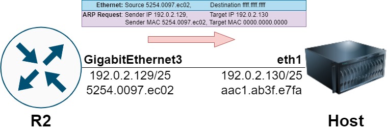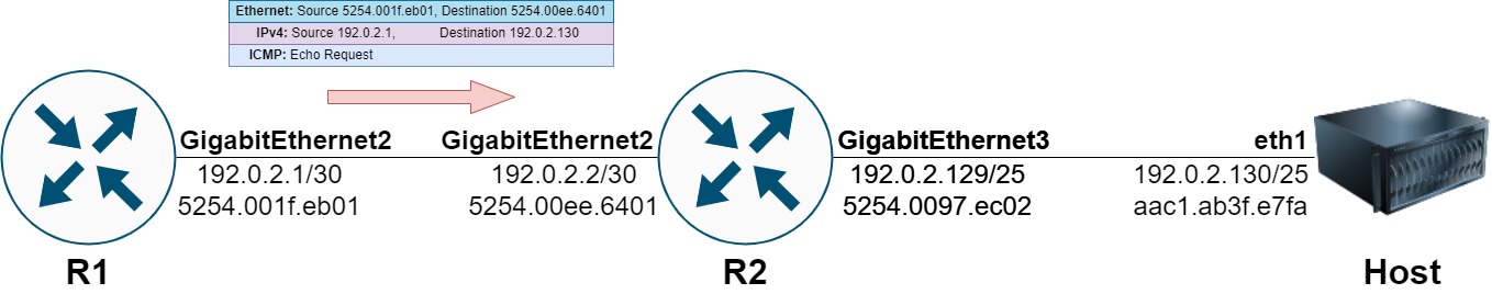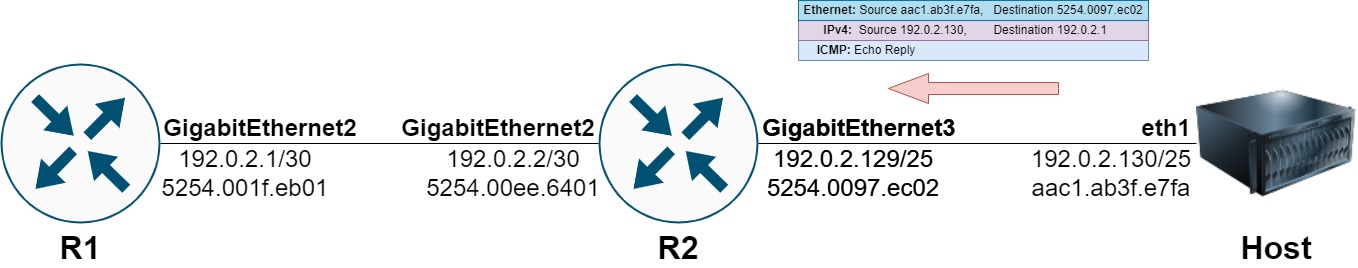 Next, R2 will need to rewrite the Ethernet header of the ICMP Echo Request packet. Specifically, it needs to determine the source and destination MAC address that will be populated in the Ethernet header. The source MAC address will be the MAC address assigned to R2’s GigabitEthernet3 interface (5254.0097.ec02) that the packet will egress from. The destination MAC address should be the MAC address assigned to Host’s eth1 interface, which is aac1.ab3f.e7fa as shown through the output of the ip link show eth command.