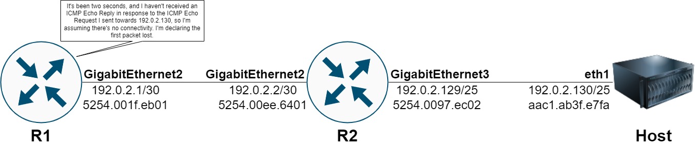 Recall that the original ICMP Echo Request packet created by R1 was dropped by R2’s control plane. R1 has no knowledge of R2’s ARP table, whether it is populated with a valid entry for 192.0.2.30, and the ultimate fate of the ICMP Echo Request packet. R1 simply expects to receive an ICMP Echo Reply packet in response to the ICMP Echo Request packet it created within the defined timeout period (default 2 seconds in Cisco IOS-XE). When this timeout period expires, R1 will mark that instance of the ping unsuccessful.