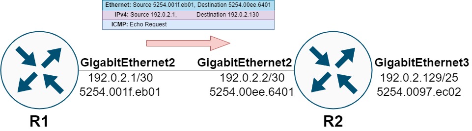 First, R2 will references its routing table for the destination IP address 192.0.2.130. In our scenario, the longest prefix match for this IP address is the 192.0.2.128/25 route directly connected to interface GigabitEthernet3.