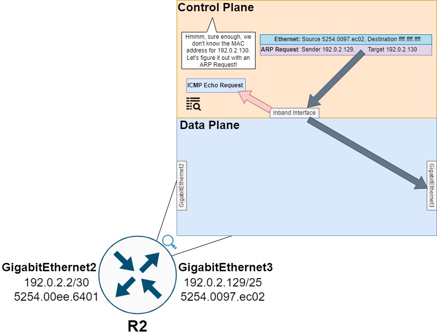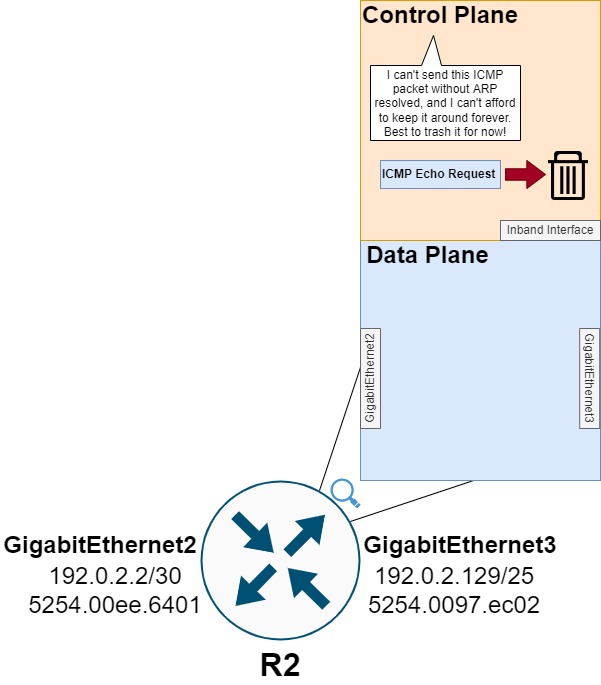 The control plane will then drop the ICMP Echo Request packet. This drop explains why the first ping in R1’s ping command fails, as the ICMP Echo Request packet never egresses R2’s GigabitEthernet3 interface towards Host.