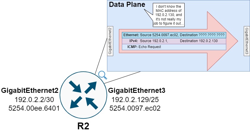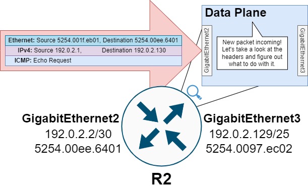 When the ICMP Echo Request packet ingresses R2, R2’s data plane will analyze the packet and attempt to make a forwarding decision on it.