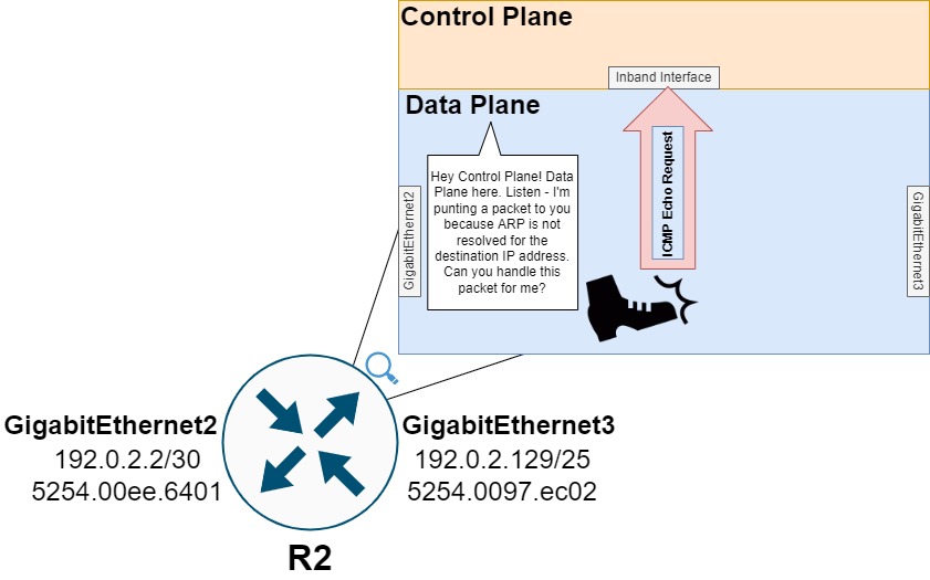 Therefore, the data plane needs to transfer this ICMP Echo Request packet to the control plane for further processing (an action commonly called a punt). Specifically, R2’s data plane will punt this ICMP Echo Request packet to the control plane using a “glean” adjacency, as shown by the output of show ip cef 192.0.2.130 internal below.