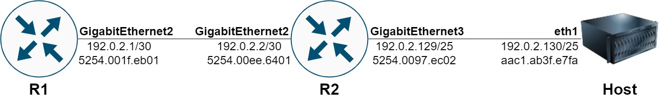 This topology involves three devices - two Cisco Catalyst 8000v virtual routers running Cisco IOS-XE 17.08.01a, and a Linux host named “Host” running the Ubuntu 20.04 operating system. The first Catalyst 8000v virtual router is named “R1”, and its GigabitEthernet2 interface is assigned IPv4 address 192.0.2.1/30. R1’s GigabitEthernet2 interface connects to GigabitEthernet2 of the second Catalyst 8000v virtual router, which is named “R2”. R2’s GigabitEthernet2 interface is assigned IPv4 address 192.0.2.2/30. R2’s GigabitEthernet3 interface is assigned an IPv4 address of 192.0.2.129/25 is directly connected to Host’s eth1 interface with an IPv4 address of 192.0.2.130/25.